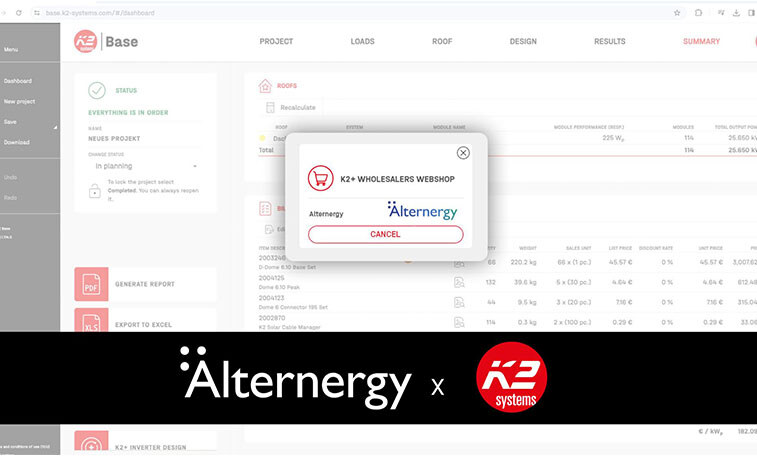 Alternergy is excited to announce a significant enhancement to the K2 Base planning software. From now on, a new, free K2+ feature is available to our customers, streamlining and accelerating the ordering process. With this update, required items can be sent directly to the shopping cart of our website via the new interface.